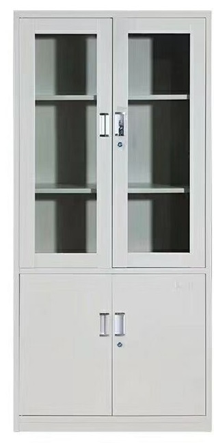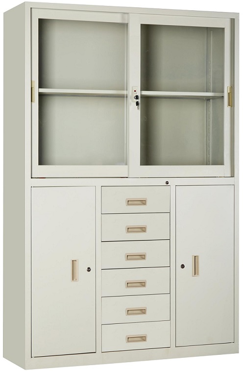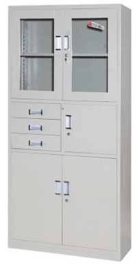 此柜選用0.8mm厚優(yōu)質(zhì)冷扎鋼制作,上層門為玻璃推拉門,門內(nèi)帶一塊活動(dòng)隔板,每門外帶鋁合金拉手,帶鎖;下層為中間帶六個(gè)抽屜,每個(gè)抽屜帶鋁合金拉手,兩側(cè)為單門柜,門帶鋁合金拉手,帶鎖。所有金屬作脫脂、除銹、酸洗、磷化、干燥等12道防銹工序處理后高溫靜電噴涂。無氣泡、無裂縫、表面光潔、靜電噴塑、烘干處理、高溫固化,表面無脫色現(xiàn)象,要求光滑無毛刺。使其牢固耐用,美觀大方!